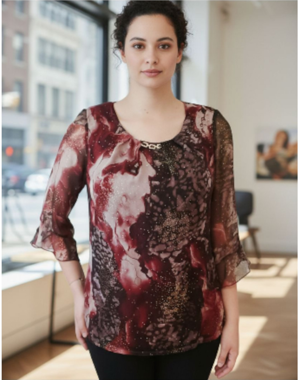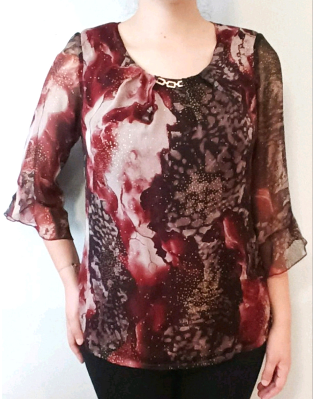 Μπλούζα εμπριμέ υφασμάτινη (διπλό ύφασμα) με χρυσές πιτσιλιές , μανίκι 3/4 με βολάν και χρυσό αλυσιδάκι στη λαιμόκοψη! Απο τα καλύτερα best seller μας από άποψη πατρόν και ραφής!