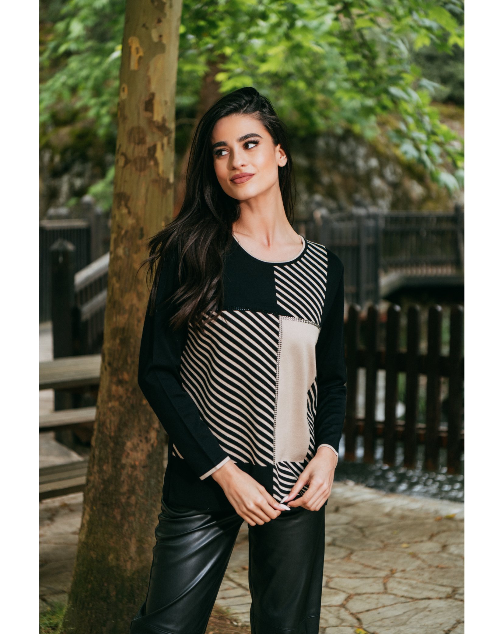 Πλεκτή μπλούζα δίχρωμη, με στρας και γεωμετρικά σχέδια. Έχει λαιμόκοψη και μακρύ μανίκι.