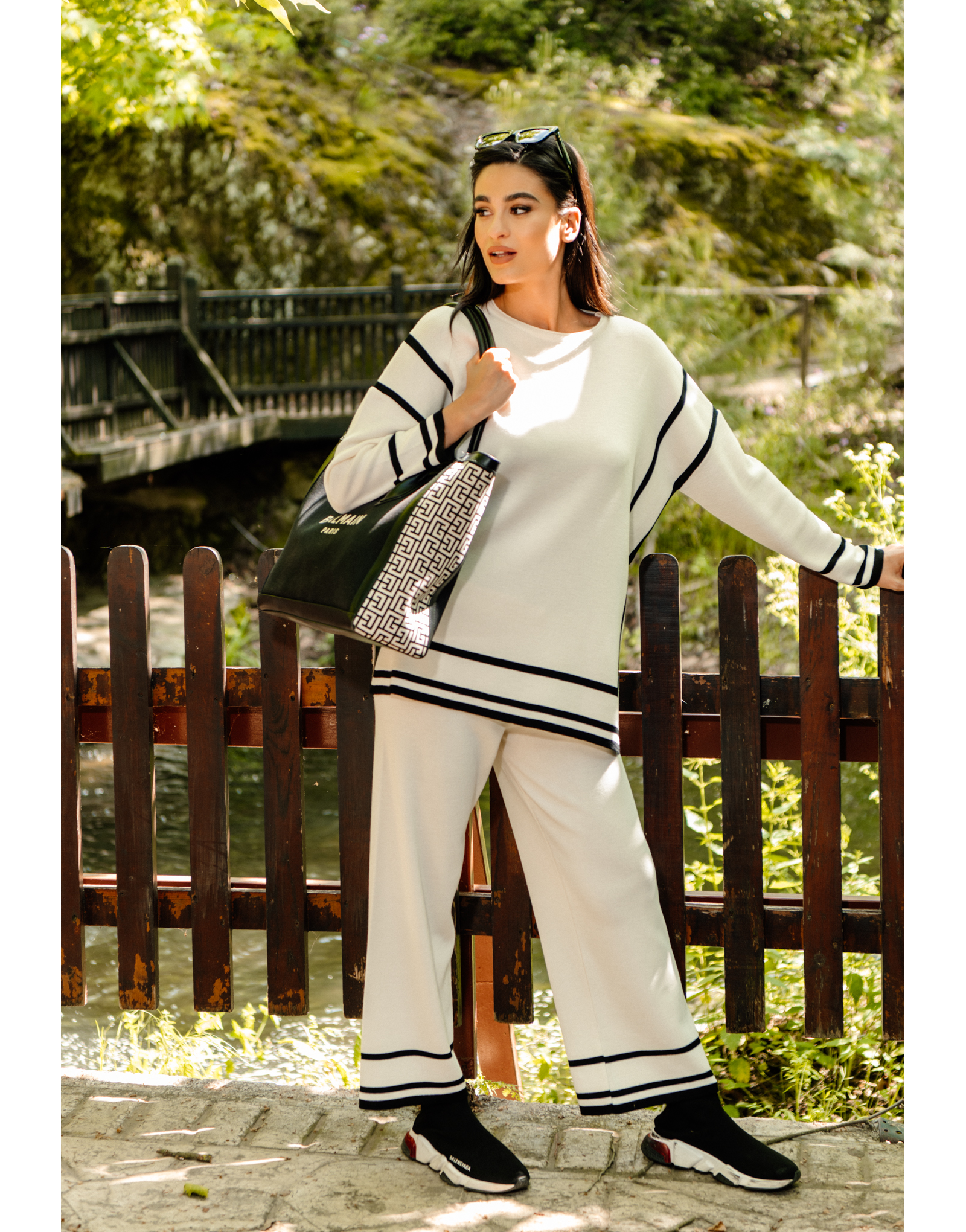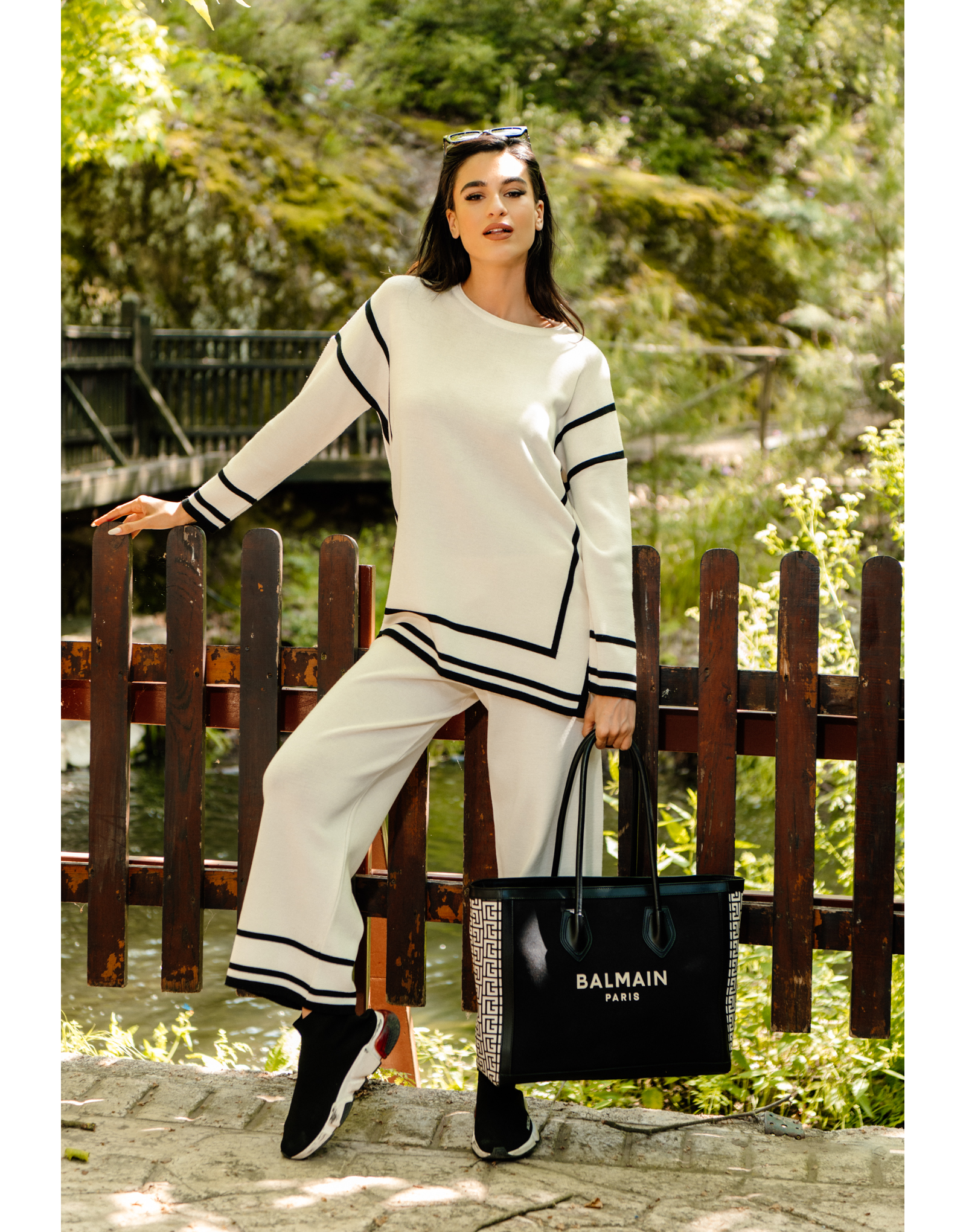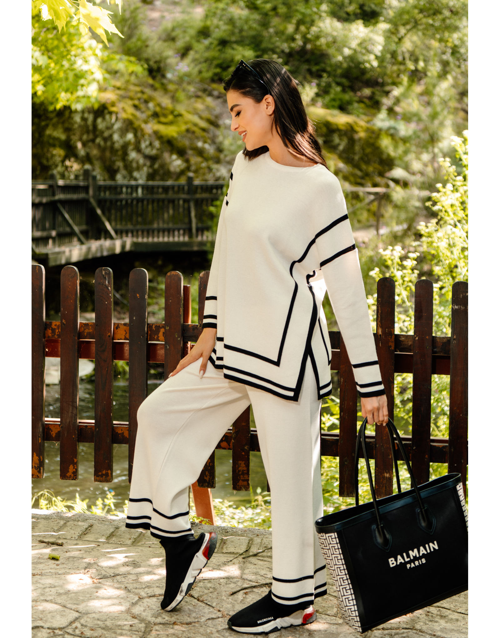 Πλεκτή μπλούζα με ανοίγματα. Πλεκτή μπλούζα με μαλλί μερινός, τετραγωνισμένη, σε άνετη ίσια γραμμή με διακοσμητικές μαύρες γραμμές και ανοίγματα στο κάτω μέρος στα πλαϊνά της μπλούζας.