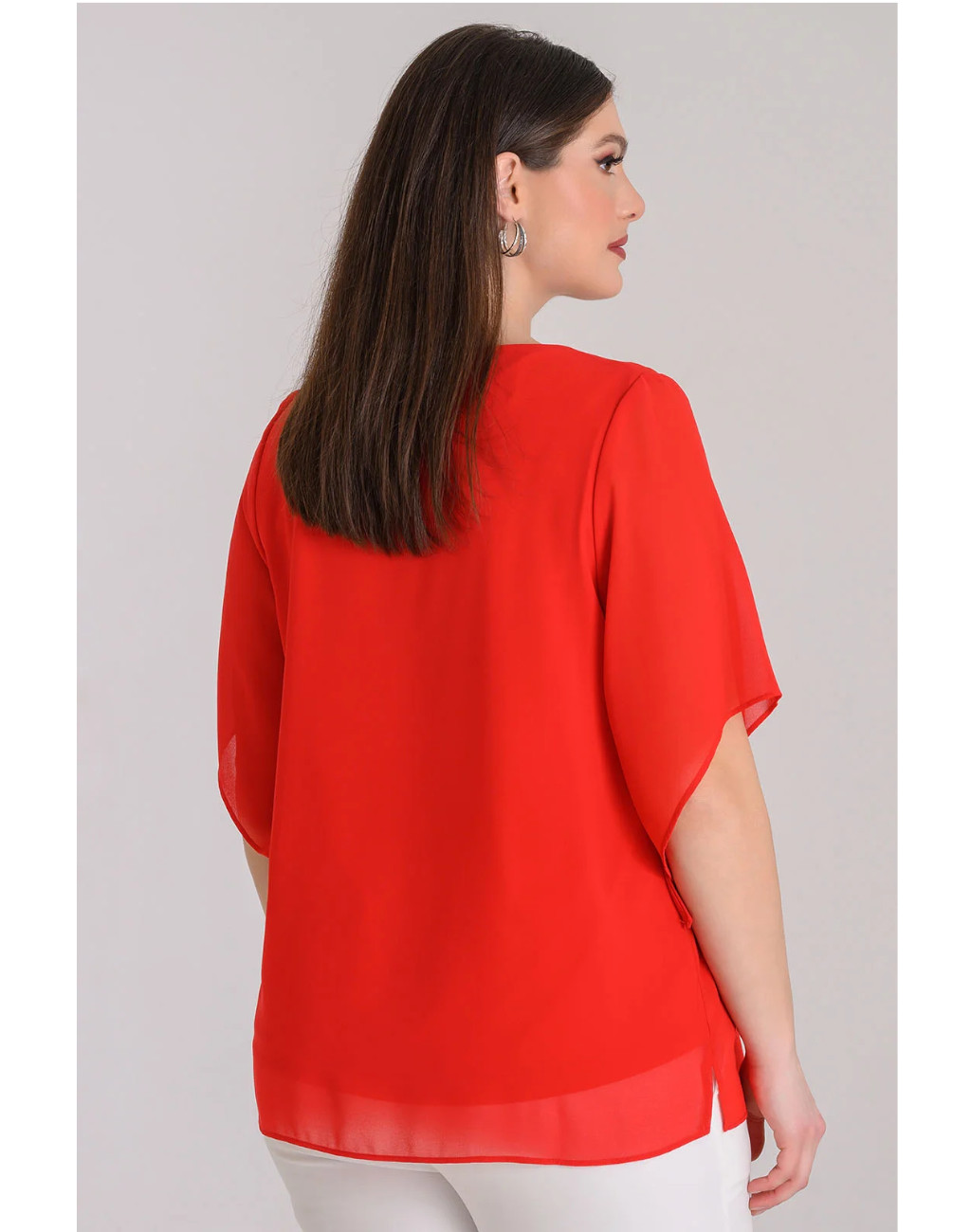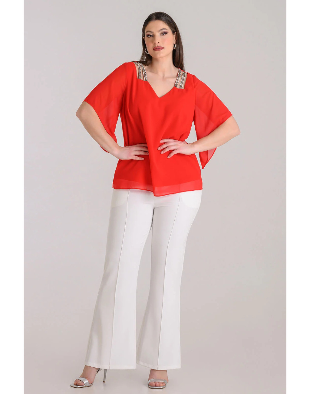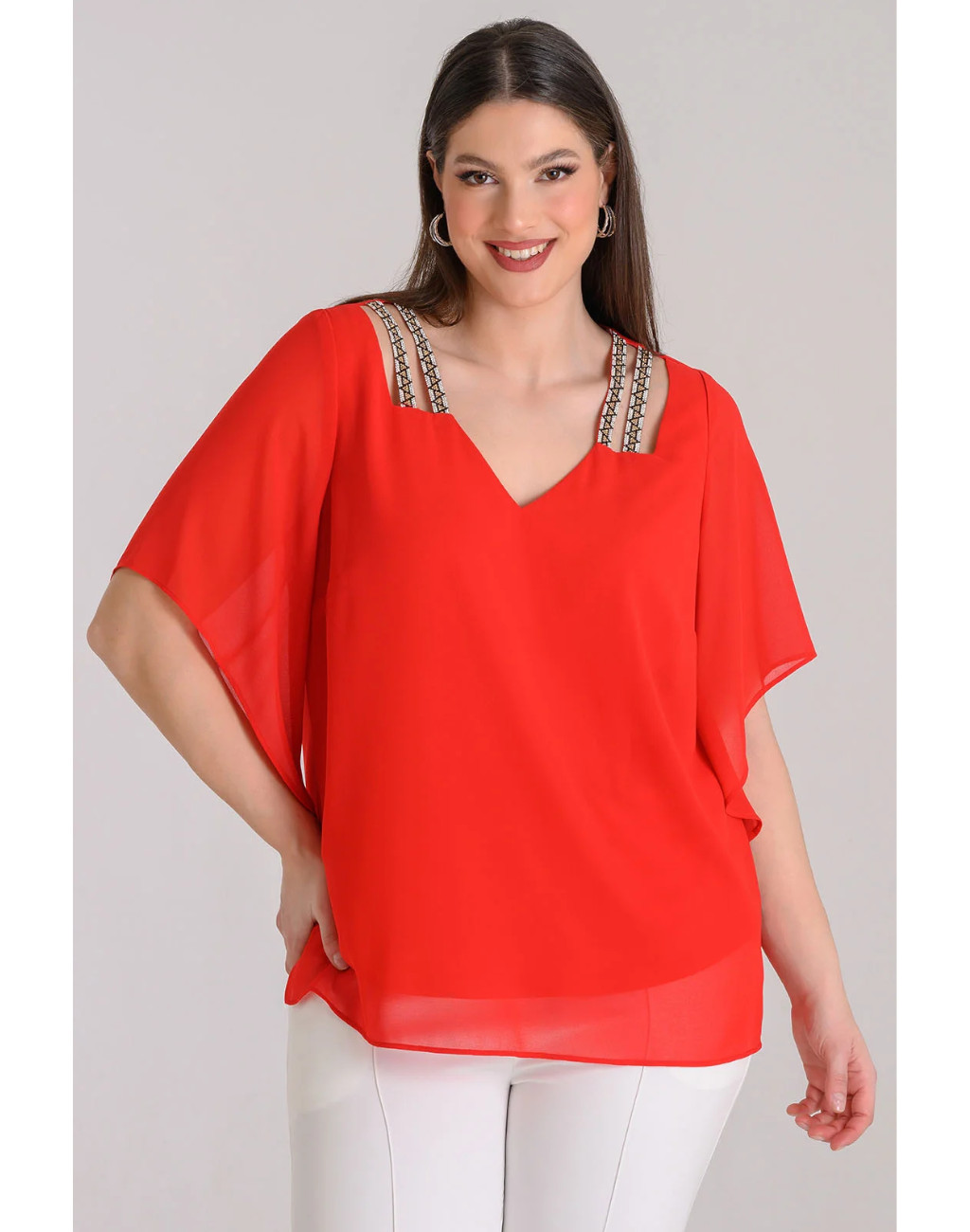Μπλούζα μουσελίνα με τρέσα με στρας στους ώμους. Κομψός σχεδιασμός με τα ανοίγματα στους ώμους να προσδίδουν έναν ιδιαίτερο χαρακτήρα. Αέρινη με άψογη εφαρμογή.