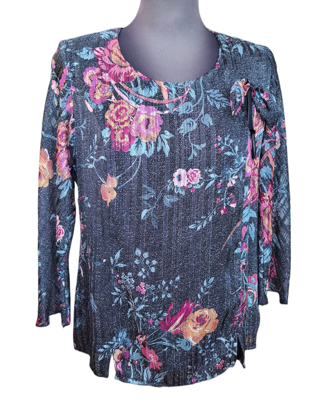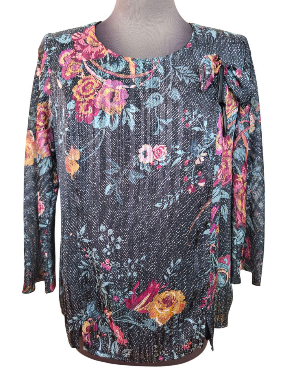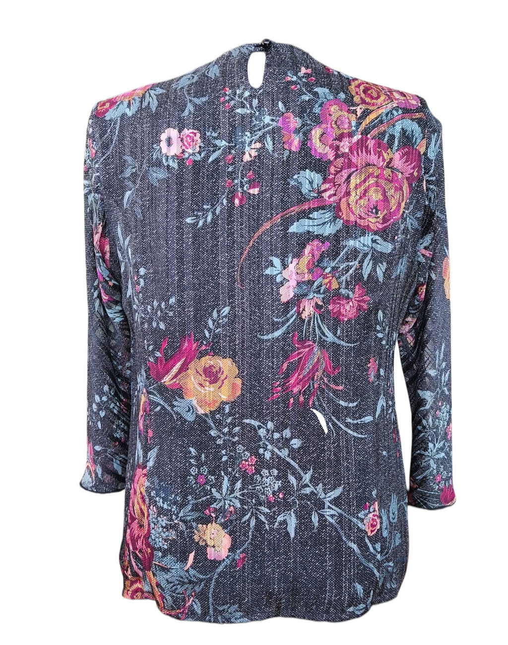 Μπλούζα μουσελίνα λαιμόκοψη με χρυσοκλωστή (lurex) και διακοσμητικη καρφιτσα φιογκακι . Έχει λαιμόκοψη λίγο πιο ανοιχτή και πίσω ένα μικρό άνοιγμα με κουμπάκι στο λαιμό.